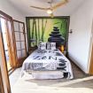 En la planta baja encontrarás un salón decorado con un mural que simula vistas al mar, una cocina totalmente equipada y un baño completo. En la planta superior, tres dormitorios con cama de matrimonio y un segundo baño.